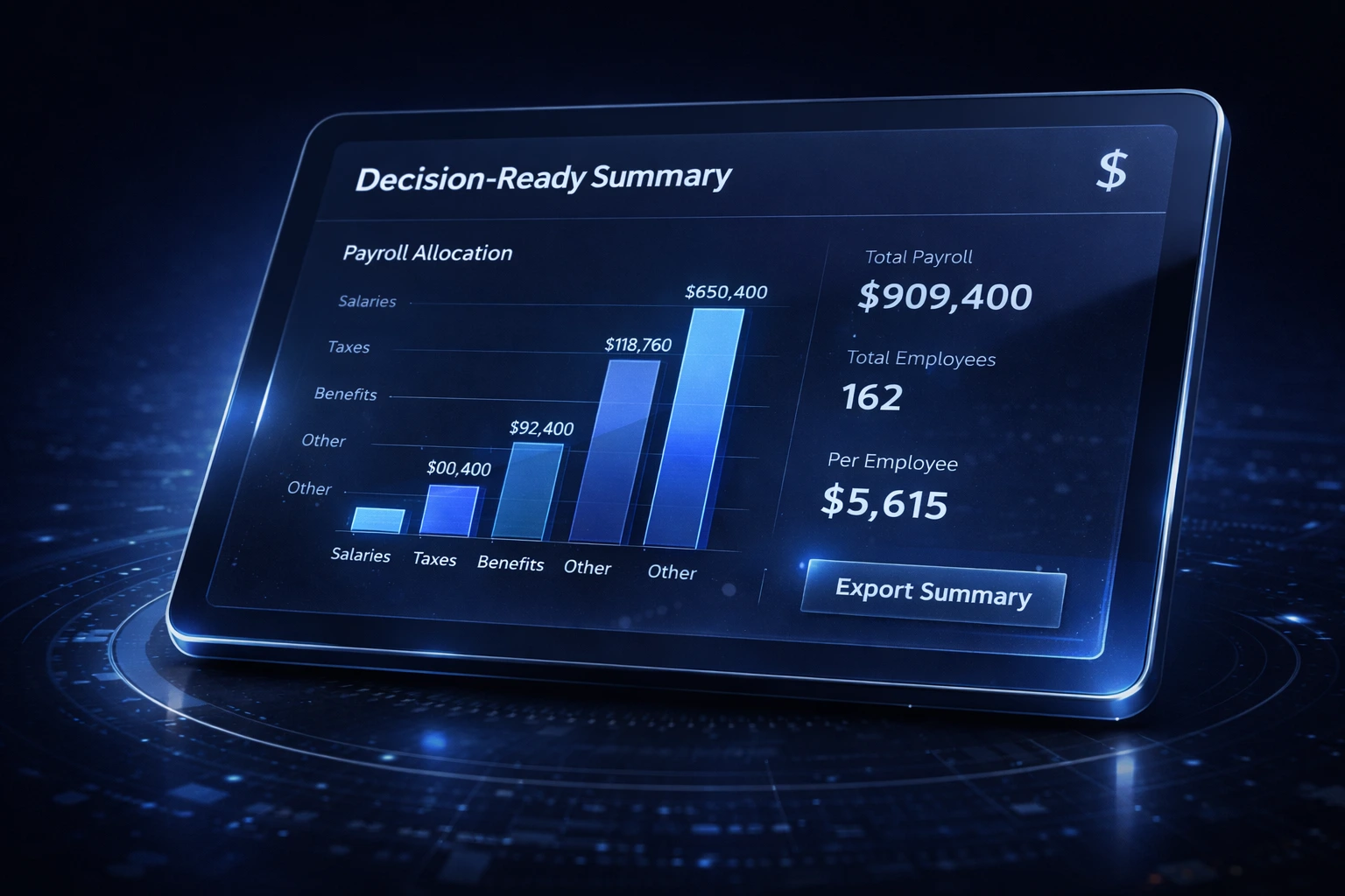 Decision-ready summaries with clear allocations, scenario deltas, and export-first outputs—built to hold up in leadership and audit conversations.